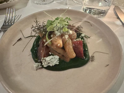 Heel lekker gegeten. We kozen het vegetarische menu. Het kon aangepast worden naar een vegan menu als we dat zouden willen, maar zonder bepaalde sauzen was de beleving minder en kozen we deels voor aanpassingen naar een vegan menu en deels voor een vegetarisch menu. We hebben erg lekker gegeten. De smaken waren erg verfijnd en de porties waren van goede grootte zodat je naar 4 gangen echt vol zat. We lieten de vijfde gang (het kaasplankje) weg uit het menu.