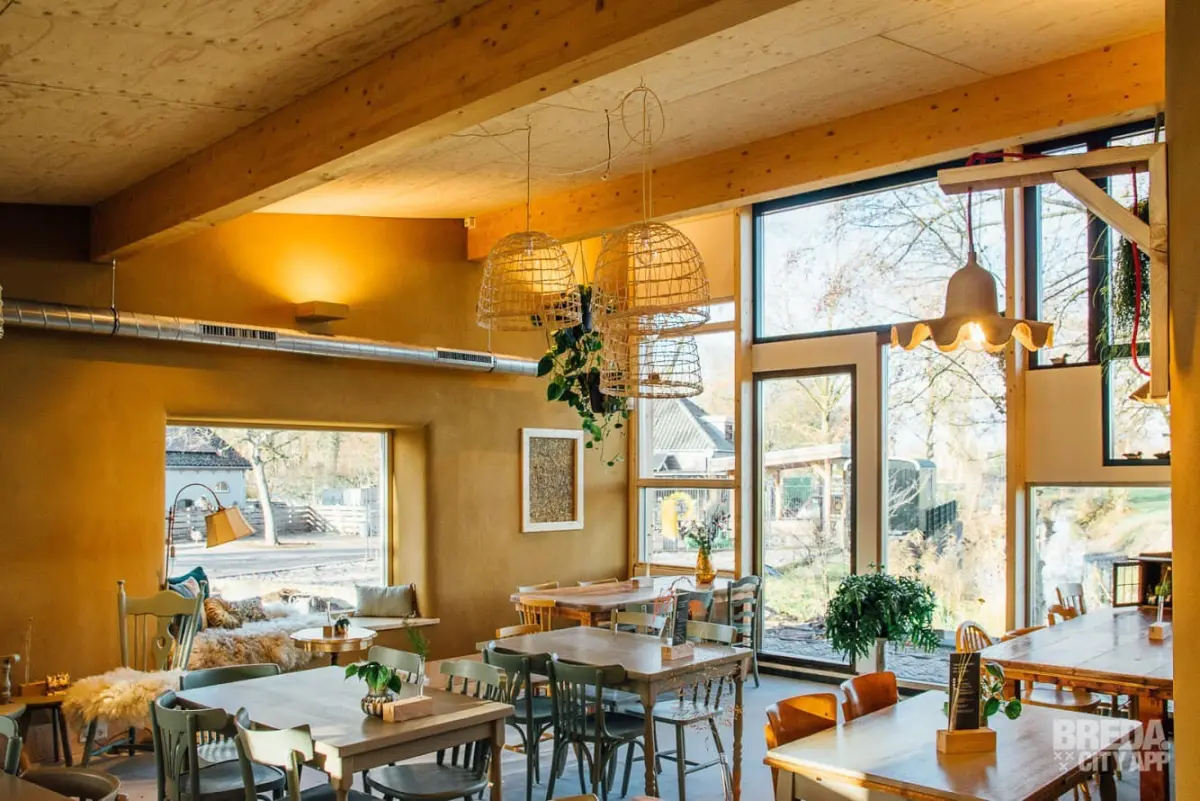 Op Boerderij Wolfslaar in Breda, met uitzicht over weilanden, bevindt zich dit lunchcafé in een duurzaam en biobased gebouw. Het restaurant werkt zoveel mogelijk met lokale en biologische producten. Op de kaart staan koffie, huisgemaakte taart en lunch met heerlijke vegan en vegetarische gerechten.